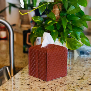 Elevate your home decor with our Rattan PU Leather Tissue Box Cover, a sophisticated and functional accessory that brings a touch of elegance to any room. This square tissue holder is crafted from high-quality PU leather with a rattan woven pattern, ensuring durability and long-lasting use. The design features a convenient top-opening lid, making it easy to access tissues while keeping them neatly organized.
