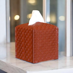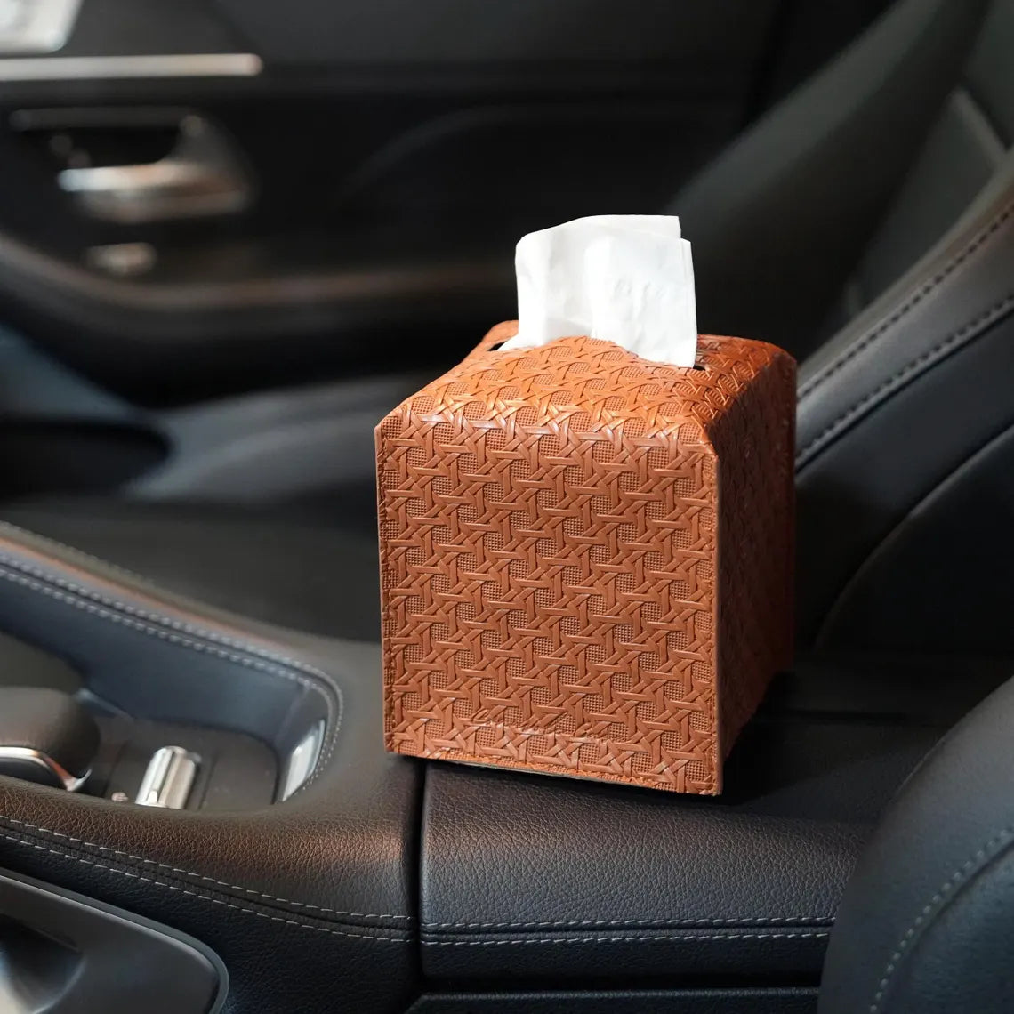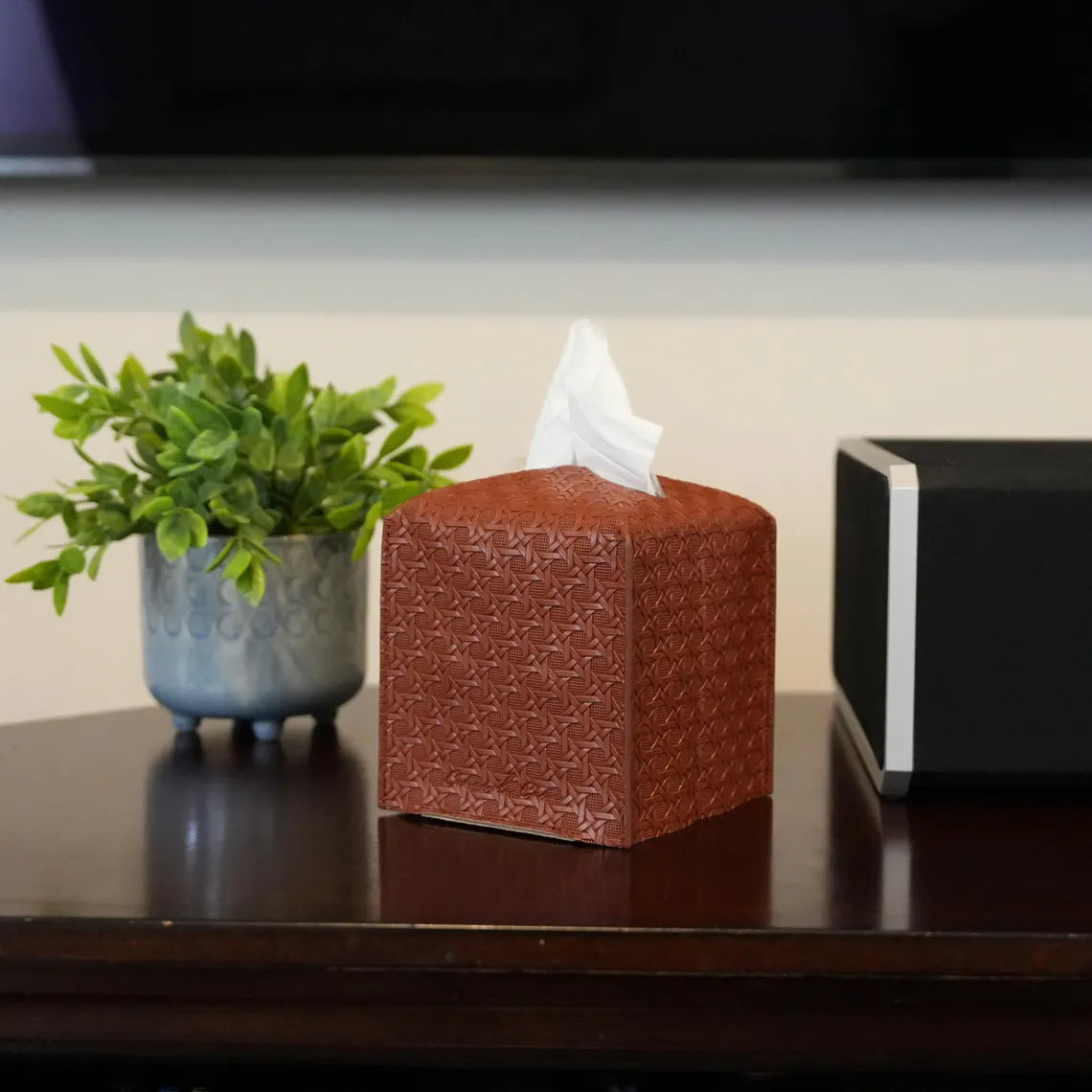Premium Rattan Pu Leather Tissue Box Cover Square, Modern Design Brown Colour